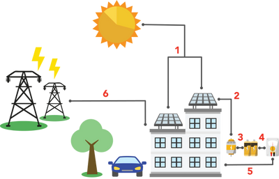 2, 3, 4. This solar power gets transferred to the inverter(s), which converts the energy from DC to AC power.